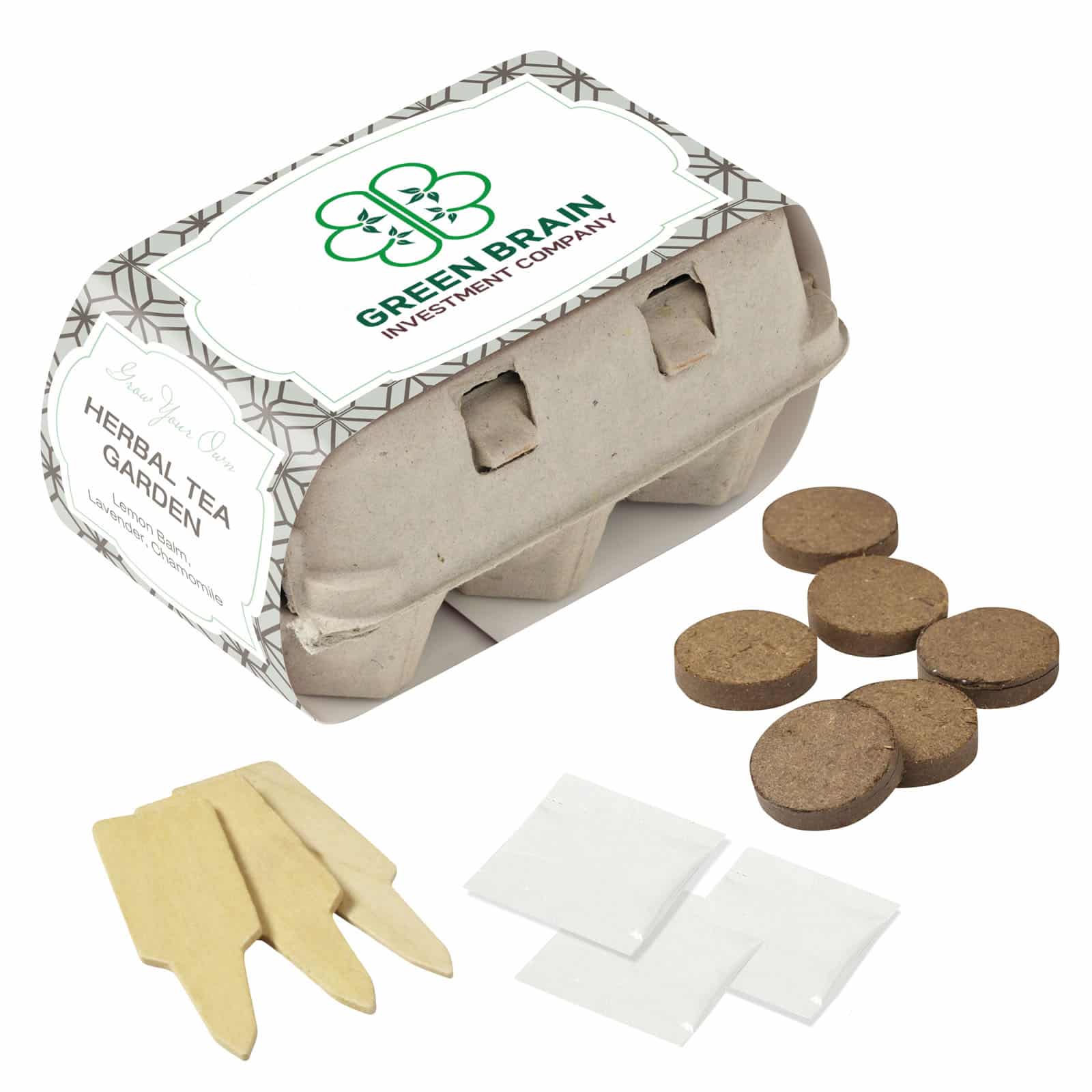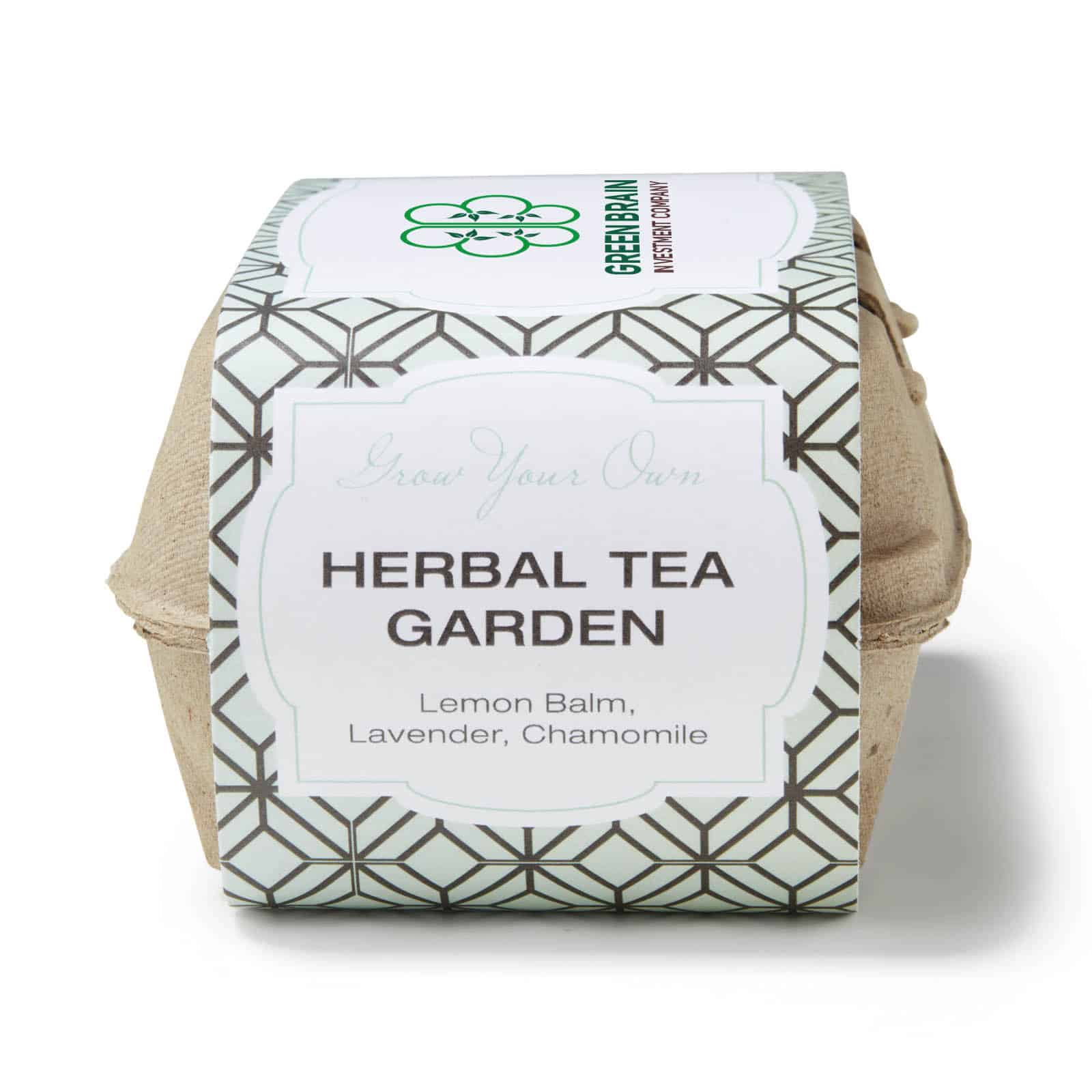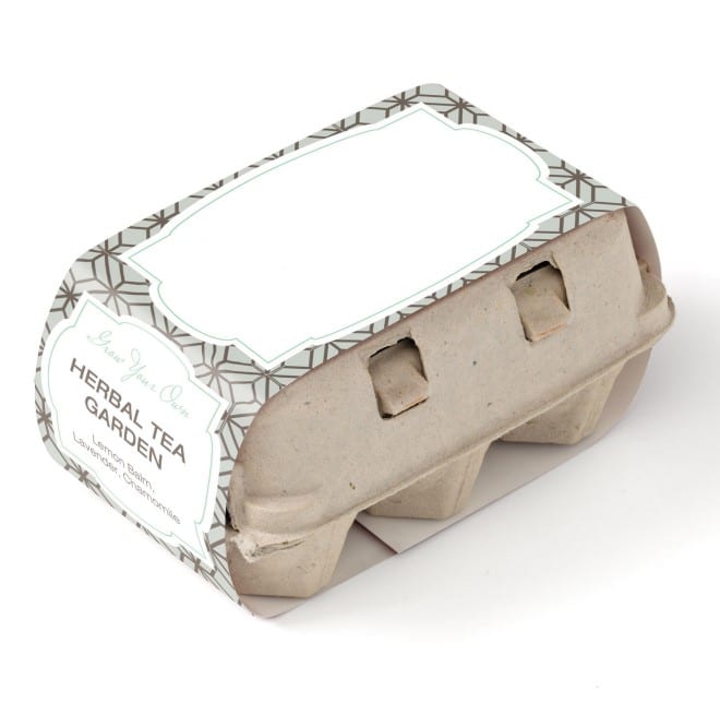 Grow-Your-Own Herbal Tea Garden Kits contain 3 packages of seeds and starter soil, plus wooden plant stakes, all inside a recycled 6 count egg carton! Write on the wooden stakes, to identify the seed type in each compartment! Use our stock design belly band and add your logo for a fantastic representation of your brand or create your own with our custom option. Seeds include: Lemon Balm, Lavender, and Chamomile. Complies with Prop 65. 3″ D x 6.5″ W x 4″ H